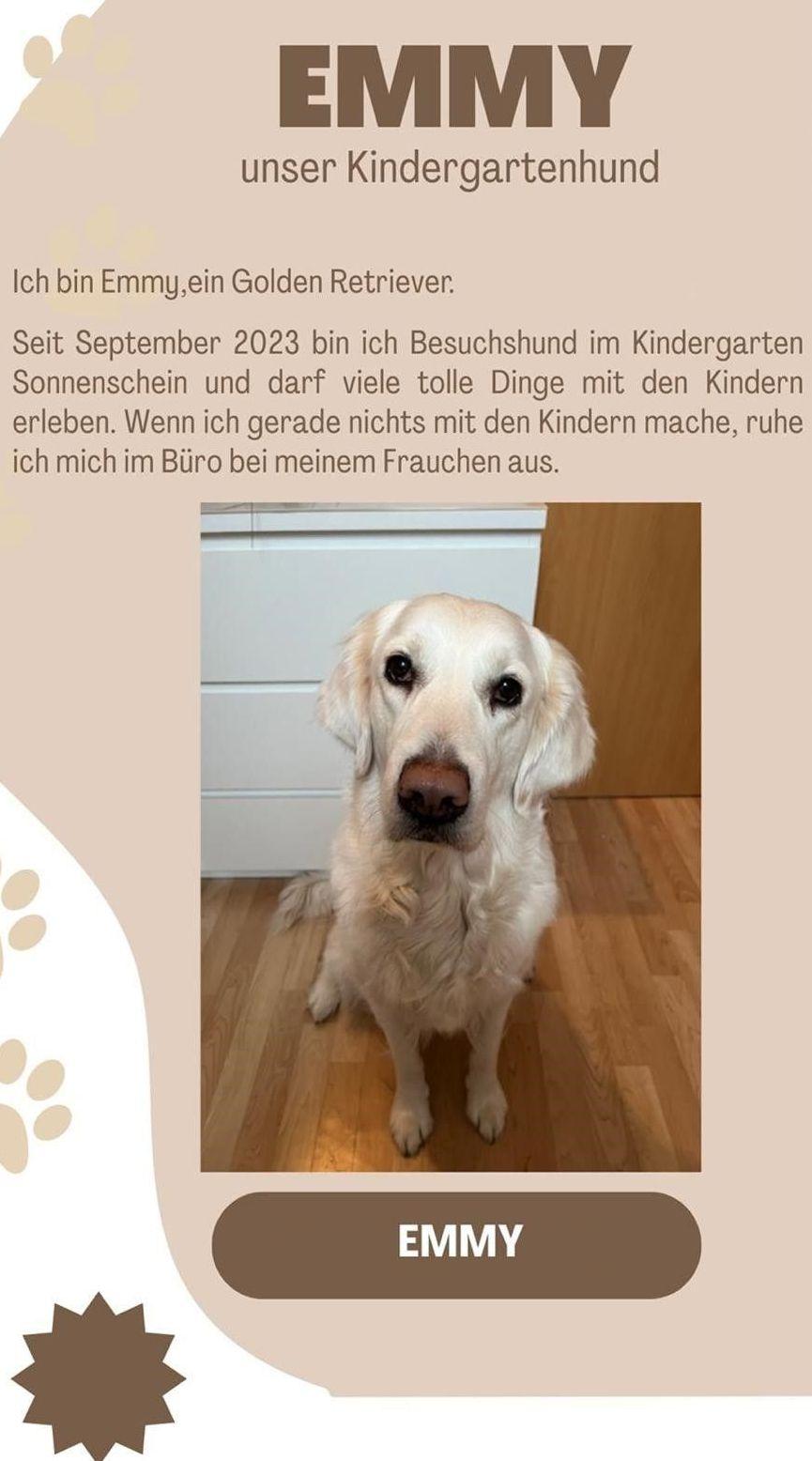 Immer wiederkehrende Aktionen integrieren spielerisch unseren Kindergartenhund "Emmy" ins Kindergarten geschehen. Die Besuche von "Emmy" sind eine bereichernde Erfahrung für die Kinder. Der Fokus liegt auf der freiwilligen Teilnahme der Kinder, um den Bedürfnissen aller gerecht zu werden.